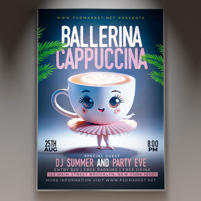 Ballerina Cappuccina Event Flyer TemplatePrepare to announce an event of delicate grace and delightful indulgence with our dedicated Ballerina Cappuccina Event Flyer Template! Building upon the exquisite charm, this design is specifically tailored for promoting gatherings that seamlessly blend the elegance of ballet with the comforting warmth of a café atmosphere, perfect for any time of day or evening. Whether you’re organizing a special dance performance followed by refreshments, a ballet-themed social event at a cozy venue, a sophisticated fundraising gala, or any occasion that beautifully combines artistic beauty with a relaxed and inviting ambiance, this flyer template is designed to capture attention and evoke a sense of refined pleasure. Expect to see graceful imagery, perhaps featuring silhouettes of ballerinas or delicate ballet shoes, subtly intertwined with café elements like coffee cups or swirling foam, all presented in a soft and elegant color palette that exudes sophistication and warmth, suitable for any time the event is held. The Ballerina Cappuccina Event Flyer Template offers a beautifully designed and highly adaptable layout, ensuring that you can clearly communicate all the essential details of your event while perfectly maintaining its delicate and inviting spirit, regardless of the hour. You can effortlessly customize the text fields to include the specific date and time of your event, the precise location with any relevant directions or venue details, information about ticket prices or admission details presented in a refined and clear manner, an elegant description of what attendees can expect (perhaps highlighting the artistic performances and the delightful refreshments available), specific details about any special features or guest performers, and clear contact information or sophisticated RSVP instructions. Many templates also provide the lovely option to incorporate additional graceful graphics or to fine-tune the color scheme and typography to flawlessly match the specific mood and theme of your “Ballerina Cappuccina” event, empowering you to create a truly unique and memorable promotional piece that exudes cultured charm and delightful comfort at any time. Engineered for effective promotion across both traditional and digital platforms, the Ballerina Cappuccina Event Flyer Template is created to be print-ready for producing elegant physical flyers and easily adaptable for seamless online sharing, ensuring your sophisticated invitation reaches a wide and appreciative audience, whether the event is during the day or in the evening. You can create graceful physical flyers to display in cultural centers, dance studios, or local cafés, as well as effortlessly share the flyer digitally through various social media channels with elegant captions that emphasize the blend of artistry and comfort at any time, email invitations that extend a refined welcome, and online event calendars that highlight unique and cultured happenings. This dual functionality helps to maximize visibility and cultivate a sense of refined anticipation and genuine excitement surrounding your event, no matter when it takes place. By utilizing this distinctive and beautifully designed flyer template, you’re not just announcing an event; you’re extending a graceful invitation to an experience that promises to be both artistically enriching and delightfully comforting from the very first impression, making your “Ballerina Cappuccina” event a must-attend for those seeking a blend of elegance and warmth at any time. Secure this template today and start spreading the word with grace and charm, whenever your event is scheduled! Features of the Ballerina Cappuccina Event Flyer Template