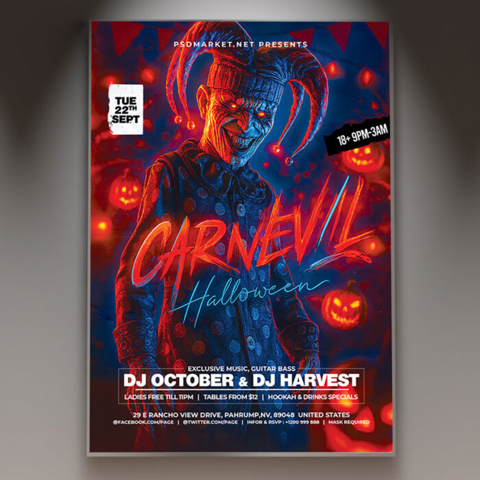 Carnevil Party Flyer TemplateStep right up and prepare to be thrilled with our chilling **Carnevil Party Flyer Template**! This dark and twisted design is perfect for promoting Halloween parties, horror-themed events, haunted houses, or any gathering that combines the festive atmosphere of a carnival with the terrifying fun of a horror show. If you’re looking to create an irresistible invitation that screams “enter if you dare,” “fear the fun,” and “the circus is in town,” this flyer template is engineered to draw a massive and daring crowd. Expect to see striking visuals, often incorporating eerie elements like sinister clowns, haunted circus tents, grotesque carnival games, and unsettling, distressed typography that captures the macabre and exhilarating spirit of a Carnevil. This template is all about setting a spine-tingling and high-energy mood, making your “Carnevil Party” the ultimate destination for an epic gathering! The **Carnevil Party Flyer Template** offers a highly adaptable and professional layout, ensuring you can clearly communicate all the essential details of your event while perfectly maintaining its horrifying and inviting spirit. You can easily customize the text fields to include the specific date and time of your party, the menacing venue location (e.g., an old warehouse, a haunted hall), any special entry requirements or ticket tiers, and information about featured entertainment (e.g., a live DJ spinning spooky tunes), special contests (e.g., a costume contest), or enticing food and drink specials (e.g., “blood” punch, carnival snacks), all presented in a clear and appealing way. Add an enticing description of what attendees can expect, perhaps highlighting opportunities for a haunted maze, a “freak show” performance, or simply mingling in a terrifyingly fun atmosphere. Detail any exciting features like a designated photo booth with creepy props, a special prize for the best-dressed ghoul, or a thrilling scavenger hunt. And of course, include clear contact information or prominent social media handles for further engagement and ticket sales. Many templates also provide exciting options to incorporate additional dynamic graphics like subtle light effects, distorted patterns, or flickering neon lights, or to adjust the impactful color palette (often deep reds, sinister blacks, and sickly yellows) to perfectly match your brand’s aesthetic or the event’s specific horror theme. This lets you create a truly unique and memorable promotional piece that looks as chilling and exciting as your event feels. Engineered for maximum reach, the **Carnevil Party Flyer Template** is designed to be both print-ready for stunning physical distribution and seamlessly optimized for digital sharing. This ensures your exciting invitation reaches a wide and enthusiastic audience. Create eye-catching physical flyers to distribute at clubs, haunted attractions, community centers, or through local event groups. Effortlessly share the flyer digitally through various social media channels with engaging captions that highlight the night’s eerie energy, email announcements that build anticipation, and online event listings that attract horror fans, party-goers, and anyone looking for a thrilling night. This dual functionality helps to maximize visibility and create significant buzz around your Carnevil Party. By utilizing this distinctive and attention-grabbing flyer template, you’re not just announcing a party; you’re creating an invitation that broadcasts pure thrilling fun and promises an experience filled with great music, costumes, and unforgettable scares, making your “Carnevil Party” the ultimate destination for an epic gathering. Grab this template today and prepare to scare up some fun! — Features of the Carnevil Party Flyer Template
