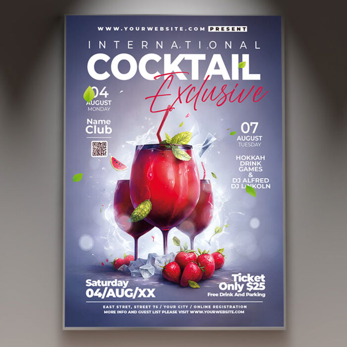 Cocktail Party Flyer TemplateShake up your next event with our chic and sophisticated **Cocktail Party Flyer Template**! This elegant and modern design is perfect for promoting happy hours, cocktail lounges, exclusive bar openings, or any gathering that celebrates mixology and stylish socializing. If you’re looking to create an irresistible invitation that whispers “sip and savor,” “an evening of distinction,” and “mix, mingle, and unwind,” this flyer template is engineered to draw a discerning and enthusiastic crowd. Expect to see striking visuals, often incorporating classic elements like sleek cocktail glasses, vibrant drink splashes, polished bar tools, and an elegant, modern typography that captures the smooth and sophisticated spirit of a cocktail event. This template is all about setting a stylish and high-energy mood, making your “Cocktail Party” the ultimate destination for an epic gathering! The **Cocktail Party Flyer Template** offers a highly adaptable and professional layout, ensuring you can clearly communicate all the essential details of your event while perfectly maintaining its refined and inviting spirit. You can easily customize the text fields to include the specific date and time of your party, the stylish venue location (e.g., a trendy bar, a private lounge), any special entry requirements or ticket tiers, and information about featured mixologists, signature drinks, or special food pairings, all presented in a clear and appealing way. Add an enticing description of what attendees can expect, perhaps highlighting opportunities for a special “mixology class,” a “best cocktail” contest, or simply mingling in a classic and inviting atmosphere. Detail any exciting features like a designated VIP area with a special drink menu, a special prize for the best-dressed guest, or a special tasting of a limited-edition cocktail. And of course, include clear contact information or prominent social media handles for further engagement and ticket sales. Many templates also provide exciting options to incorporate additional dynamic graphics like subtle light effects, classic patterns, or vintage engravings, or to adjust the impactful color palette (often deep reds, rich blues, and elegant blacks) to perfectly match your brand’s aesthetic or the event’s specific theme. This lets you create a truly unique and memorable promotional piece that looks as classic and sophisticated as your event feels. Engineered for maximum reach, the **Cocktail Party Flyer Template** is designed to be both print-ready for stunning physical distribution and seamlessly optimized for digital sharing. This ensures your exciting invitation reaches a wide and enthusiastic audience. Create eye-catching physical flyers to distribute at clubs, restaurants, liquor stores, or through local event groups. Effortlessly share the flyer digitally through various social media channels with engaging captions that highlight the night’s elegant energy, email announcements that build anticipation, and online event listings that attract cocktail enthusiasts, spirits lovers, and anyone looking for a night of classic enjoyment. This dual functionality helps to maximize visibility and create significant buzz around your Cocktail Party. By utilizing this distinctive and attention-grabbing flyer template, you’re not just announcing a party; you’re creating an invitation that broadcasts pure stylish fun and promises an experience filled with great drinks, great company, and unforgettable memories, making your “Cocktail Party” the ultimate destination for an epic gathering. Grab this template today and prepare to shake things up! — Features of the Cocktail Party Flyer Template