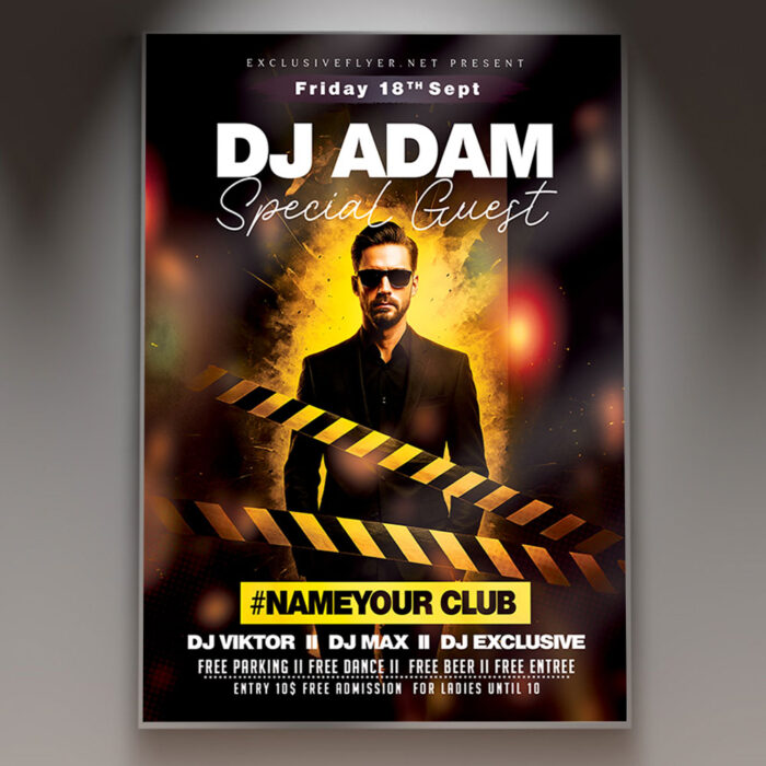 DJ Event Party Flyer TemplateAmplify the excitement and pack the dance floor for your next major bash with our electrifying **DJ Event Party Flyer Template**! This dynamic and visually stunning design is perfect for promoting club nights, festival stages, special guest DJ appearances, or any high-energy gathering where the beats are paramount and the atmosphere is electric. If you’re looking to create an irresistible invitation that screams “unforgettable night,” “pounding bass,” and “the ultimate party experience,” this flyer template is engineered to draw a massive and enthusiastic crowd eager to hit the dance floor. Expect to see striking visuals, often incorporating vibrant light shows, abstract sound waves, iconic DJ equipment, energetic crowd silhouettes, and bold, futuristic typography that captures the exhilarating and immersive spirit of a premier DJ event. This template is all about setting a high-octane and exhilarating mood, making your “DJ Event Party” the ultimate destination for music and dancing! The **DJ Event Party Flyer Template** offers a highly adaptable and professional layout, ensuring you can clearly communicate all the essential details of your event while perfectly maintaining its energetic and inviting spirit. You can easily customize the text fields to include the specific date and time of your party, the electrifying venue location, any special entry requirements or VIP ticket tiers, and information about featured DJs, supporting acts, specific music genres (e.g., EDM, techno, house, trance), or enticing drink specials, all presented in a clear and appealing way. Add an enticing description of what attendees can expect, perhaps highlighting opportunities for non-stop dancing, immersive audio-visual experiences, or simply being part of the city’s most talked-about party. Detail any exciting features like state-of-the-art sound systems, dazzling laser displays, special guest appearances, or exclusive merchandise. And of course, include clear contact information or prominent social media handles for further engagement and ticket sales. Many templates also provide exciting options to incorporate additional dynamic graphics like subtle light streaks, abstract glow effects, or distorted audio waves, or to adjust the impactful color palette (often bright, contrasting neons against deep blacks and blues) to perfectly match your brand’s aesthetic or the event’s specific electronic music theme. This lets you create a truly unique and memorable promotional piece that looks as vibrant and exciting as your party feels. Engineered for maximum reach, the **DJ Event Party Flyer Template** is designed to be both print-ready for stunning physical distribution and seamlessly optimized for digital sharing. This ensures your exciting invitation reaches a wide and enthusiastic audience. Create eye-catching physical flyers to distribute at premier nightclubs, music venues, record stores, or popular entertainment districts. Effortlessly share the flyer digitally through various social media channels with engaging captions that highlight the night’s energy, email announcements that build anticipation, and online event listings that attract party-goers, electronic music fans, and nightlife connoisseurs. This dual functionality helps to maximize visibility and create significant buzz around your DJ Event Party. By utilizing this distinctive and attention-grabbing flyer template, you’re not just announcing a party; you’re creating an invitation that broadcasts pure auditory excitement and promises an experience filled with powerful beats, dazzling visuals, and unforgettable moments, making your “DJ Event Party” the ultimate destination for an epic night of music and fun. Grab this template today and prepare for an unparalleled party experience! — Features of the DJ Event Party Flyer Template
