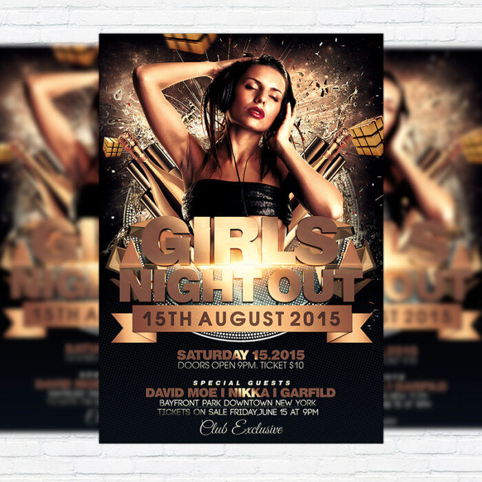 The Girls Night Out is the exclusive Photoshop PSD flyer template designed by ExclusiveFlyer to promote your Girls Night Out Party. This is a modern, stylish, black flyer and just be used for a Girls Party or Sexy Night, or VIP Party. Dear customers! – you can also: Customize any flyers or Hire Us to create any unique product. Also, you can get unlimited access to all our templates. You can buy 1 month membership, 3 or 6 months membership or even 1 year membership plan and login on site, choose a design, click the button DOWNLOAD TEMPLATE and it’s yours. No hassle, no checkout! When you paid the template, you can find it in your personal account and of course you’ve got a message to your e-mail (maybe in spam) with link to download. Also, you can find all templates, which you buy, in your personal account! All of our flyers have a very good quality (300DPI). And it means that you just need to download one of them and make the necessary modifications such as replace the elements or choose the colors and start to invite your guests! You can order from us design of Banner Ad, Bi-Fold Brochure, Tri-Fold Brochure, Business Card, Logo, One-Sided Flyer, Two-sided Flyer or Postcard. All you need is to checkout and write us all information on our e-mail or skype. (order now). There are a lot of free flyer templates, free business card templates on our site! Also there are a lot of categories of flyers such as club flyers, seasonal flyers, sport flyers and also business flyers. You have a great choise on our site, so good luck! Don’t forget to follow our Facebook community, our page on Twitter, on Pinterest and on Tumblr and leave comments, cause we work for you! PSD is set up in 1275×1875 dimension (4″×6″ with 0,25″ bleed). The PSD file is very well organised, with color coded groups and layers named appropriately. Remember, all stock images of models and other people used only for demonstration all charms of the flyer and don’t included in the download!
