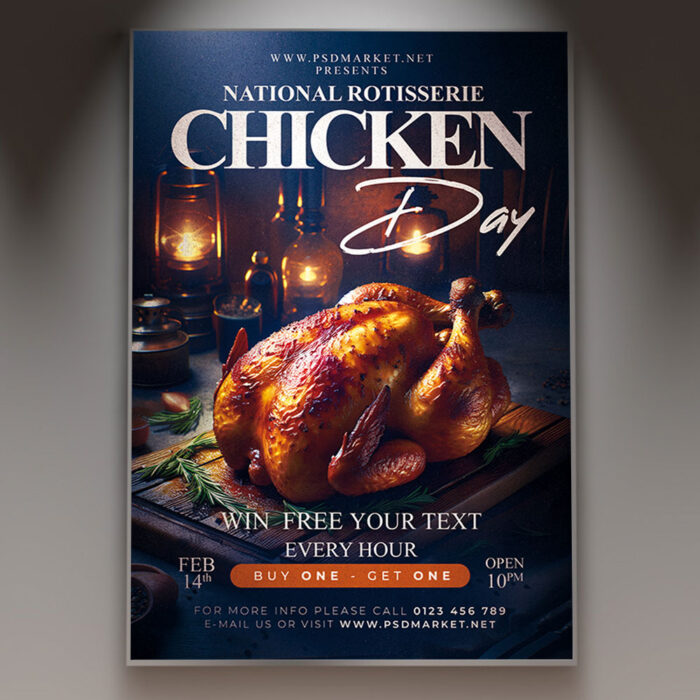 Happy National Rotisserie Chicken Day Flyer TemplateIgnite a nationwide celebration of flavor and joy with our cheerful **Happy National Rotisserie Chicken Day Flyer Template**! This vibrant and appetizing design is perfect for promoting any large-scale event commemorating this beloved national food holiday. Whether you’re a major restaurant chain, a supermarket deli with multiple locations, or organizing a community-wide food festival, this template is engineered to bring smiles and make stomachs rumble across the country. If you’re looking to highlight the crispy skin, juicy meat, and irresistible aroma of perfectly roasted chicken in a truly celebratory way, expect to see bright, inviting visuals. These might feature golden-brown rotisserie chickens, festive elements like confetti or balloons, or happy crowds enjoying their meal, all combined with cheerful, bold typography and warm, uplifting color schemes that evoke the pure delight of a freshly cooked meal on a national scale. This template is all about broadcasting happiness and making your “Happy National Rotisserie Chicken Day” event a joyous culinary sensation! The **Happy National Rotisserie Chicken Day Flyer Template** offers a highly adaptable and enticing layout, ensuring you can clearly communicate all the essential details of your nationwide event while perfectly maintaining its delicious and celebratory spirit. You can easily customize the text fields to include the specific date and time of your happy national celebration, the participating locations (whether national chains or local branches), information about special nationwide pricing, bundles, or family meal deals presented in a clear and appealing way. Add a mouth-watering description of what attendees can expect, perhaps mentioning signature seasonings, delicious regional sides, or fun activities. Detail any unique features like live carving stations, chef demos, or special giveaways designed to enhance the joyous atmosphere across all participating venues. And of course, include clear contact information or prominent social media handles for further engagement and joyful RSVPs. Many templates also provide exciting options to incorporate additional festive graphics like national flags subtly integrated with food elements, or to adjust the warm color palette to perfectly match your brand’s aesthetic or the event’s specific celebratory theme. This lets you create a truly unique and memorable promotional piece that looks as delicious as it tastes and feels as joyful as a national holiday. Engineered for maximum reach, the **Happy National Rotisserie Chicken Day Flyer Template** is designed to be both print-ready for stunning physical distribution and easily optimized for seamless digital sharing. This ensures your delightful invitation reaches a wide and hungry audience across different regions. Create eye-catching physical flyers to post in grocery stores, restaurant windows, or community boards nationwide. Effortlessly share the flyer digitally through various social media channels with engaging captions that highlight the irresistible aroma and flavor, email announcements that make mouths water and spirits lift, and online event listings that tempt foodies with a joyful, nationwide invitation. This dual functionality helps to maximize visibility and create significant buzz around your Happy National Rotisserie Chicken Day event. By utilizing this distinctive and attention-grabbing flyer template, you’re not just announcing a promotion; you’re creating an invitation that broadcasts pure culinary delight and promises an experience that brings the savory joy of rotisserie chicken to life on a national level, making your “Happy National Rotisserie Chicken Day” an unmissable feast of happiness. Grab this template today and prepare to serve up some serious smiles and deliciousness across the nation! — Features of the Happy National Rotisserie Chicken Day Flyer Template