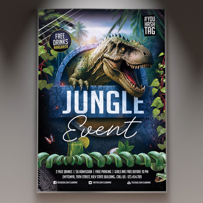 Jungle Event Flyer TemplateUnleash the wild and invite adventurers to an unforgettable expedition with our captivating **Jungle Event Flyer Template**! This vibrant and immersive design is perfect for promoting themed parties, club nights, outdoor festivals, or any gathering where a wild, untamed atmosphere is the main attraction. If you’re looking to create an irresistible invitation that screams “exotic adventure,” “lush vibes,” and “a night in the wild,” this flyer template is engineered to draw an adventurous and enthusiastic crowd ready to explore. Expect to see striking visuals, often incorporating lush tropical foliage, exotic animals, mysterious ruins, vibrant colors, and bold, adventurous typography that captures the exhilarating and untamed spirit of a jungle-themed event. This template is all about setting an adventurous and immersive mood, making your “Jungle Event” the ultimate destination for an epic escape into the wild! The **Jungle Event Flyer Template** offers a highly adaptable and professional layout, ensuring you can clearly communicate all the essential details of your event while perfectly maintaining its energetic and inviting spirit. You can easily customize the text fields to include the specific date and time of your jungle expedition, the wild venue location, any special entry requirements or ticket tiers, and information about featured DJs playing tribal beats, live performers with jungle-inspired acts, themed cocktails, or exciting costume contests, all presented in a clear and appealing way. Add an enticing description of what attendees can expect, perhaps highlighting opportunities for dancing under a canopy of lights, encountering mystical creatures (costumed performers), or simply embracing the untamed energy of the night. Detail any exciting features like a photo booth with jungle props, immersive decor, or special discounts for early birds. And of course, include clear contact information or prominent social media handles for further engagement and reservations. Many templates also provide exciting options to incorporate additional dynamic graphics like subtle fog effects, glowing flora, or ancient symbols, or to adjust the impactful color palette (often deep greens, earthy browns, and vibrant pops of exotic colors) to perfectly match your brand’s aesthetic or the event’s specific wild theme. This lets you create a truly unique and memorable promotional piece that looks as authentic and exciting as your event feels. Engineered for maximum reach, the **Jungle Event Flyer Template** is designed to be both print-ready for stunning physical distribution and seamlessly optimized for digital sharing. This ensures your exciting invitation reaches a wide and enthusiastic audience. Create eye-catching physical flyers to distribute at clubs, outdoor venues, themed restaurants, or community centers. Effortlessly share the flyer digitally through various social media channels with engaging captions that highlight the night’s mystery, email announcements that build anticipation, and online event listings that attract adventure-seekers, party-goers, and anyone looking for a unique and immersive experience. This dual functionality helps to maximize visibility and create significant buzz around your Jungle Event. By utilizing this distinctive and attention-grabbing flyer template, you’re not just announcing a party; you’re creating an invitation that broadcasts pure adventurous joy and promises an experience filled with wild beats, lush visuals, and unforgettable moments, making your “Jungle Event” the ultimate destination for an epic gathering. Grab this template today and prepare to unleash the fun! — Features of the Jungle Event Flyer Template