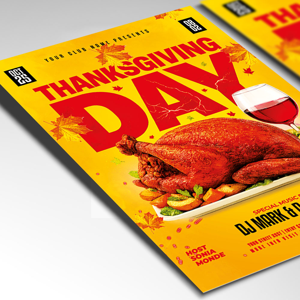 Thanksgiving Day Flyer TemplateGather ’round and give thanks with our heartwarming **Thanksgiving Day Flyer Template**! This cozy and inviting design is perfect for promoting Thanksgiving dinners, community events, special sales, or any gathering that celebrates the holiday. If you’re looking to create an irresistible invitation that says “come to the table,” “share the gratitude,” and “a feast for family and friends,” this flyer template is engineered to draw a warm and enthusiastic crowd. Expect to see striking visuals, often incorporating classic elements like a roasted turkey, autumn leaves, pumpkins, and a bold, rustic typography that captures the bountiful and grateful spirit of Thanksgiving. This template is all about setting a comfortable and inviting mood, making your “Thanksgiving Day” event the ultimate destination for an epic feast! The **Thanksgiving Day Flyer Template** offers a highly adaptable and professional layout, ensuring you can clearly communicate all the essential details of your event while perfectly maintaining its festive and inviting spirit. You can easily customize the text fields to include the specific date and time of your event, the welcoming venue location, any special entry requirements or registration details, and information about featured dishes, special discounts, or a “book now” call-to-action, all presented in a clear and appealing way. Add an enticing description of what attendees can expect, perhaps highlighting opportunities for a special “Thanksgiving feast,” a “family fun” activity, or simply mingling in a high-energy and inviting atmosphere. Detail any exciting features like a designated VIP area with a special drink menu, a special prize for the best-dressed guest, or a thrilling scavenger hunt. And of course, include clear contact information or prominent social media handles for further engagement and ticket sales. Many templates also provide exciting options to incorporate additional dynamic graphics like subtle light effects, energetic patterns, or flickering neon lights, or to adjust the impactful color palette (often deep blues, purples, and vibrant magentas) to perfectly match your brand’s aesthetic or the event’s specific theme. This lets you create a truly unique and memorable promotional piece that looks as lively and exciting as your event feels. Engineered for maximum reach, the **Thanksgiving Day Flyer Template** is designed to be both print-ready for stunning physical distribution and seamlessly optimized for digital sharing. This ensures your exciting invitation reaches a wide and enthusiastic audience. Create eye-catching physical flyers to distribute at clubs, restaurants, liquor stores, or through local event groups. Effortlessly share the flyer digitally through various social media channels with engaging captions that highlight the night’s energetic vibe, email announcements that build anticipation, and online event listings that attract music lovers, party-goers, and anyone looking for a night of classic enjoyment. This dual functionality helps to maximize visibility and create significant buzz around your Thanksgiving Day event. By utilizing this distinctive and attention-grabbing flyer template, you’re not just announcing a party; you’re creating an invitation that broadcasts pure authentic fun and promises an experience filled with great music, great company, and unforgettable memories, making your “Thanksgiving Day” event the ultimate destination for an epic gathering. Grab this template today and get ready to dance the night away! — Features of the Thanksgiving Day Flyer Template