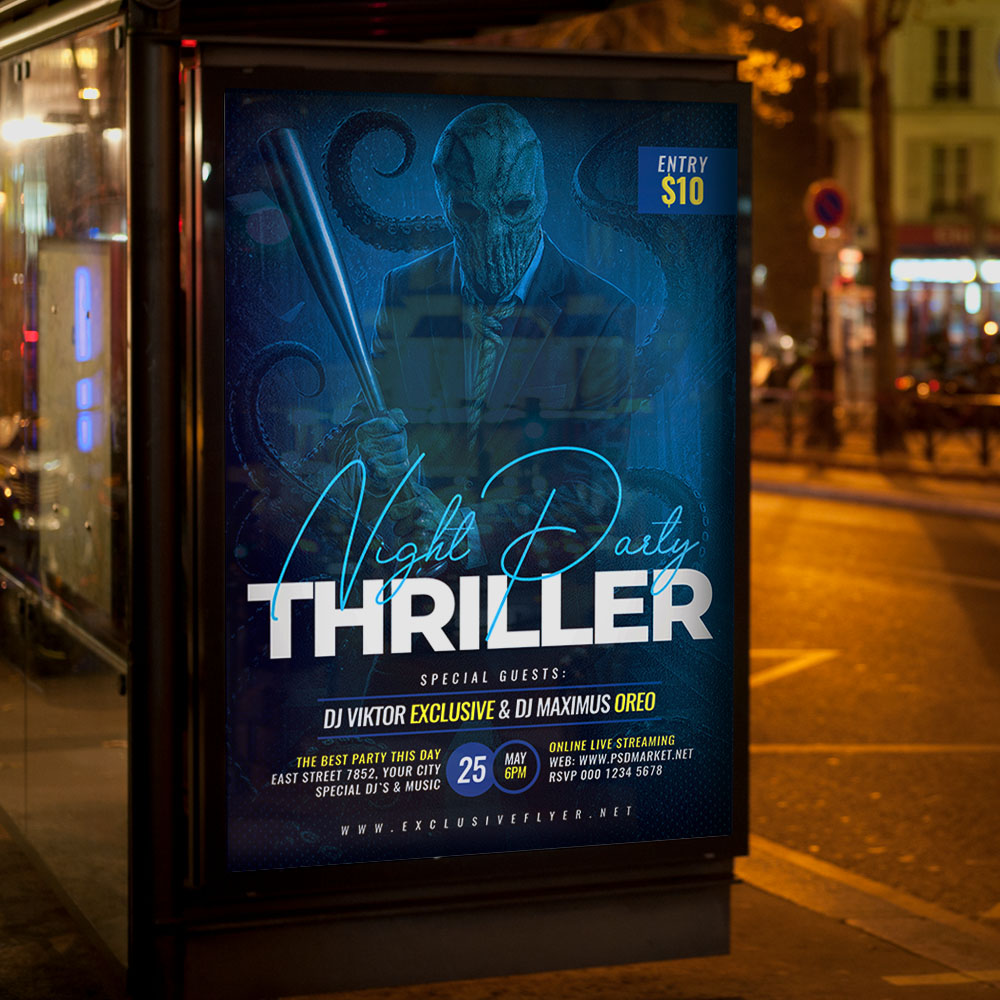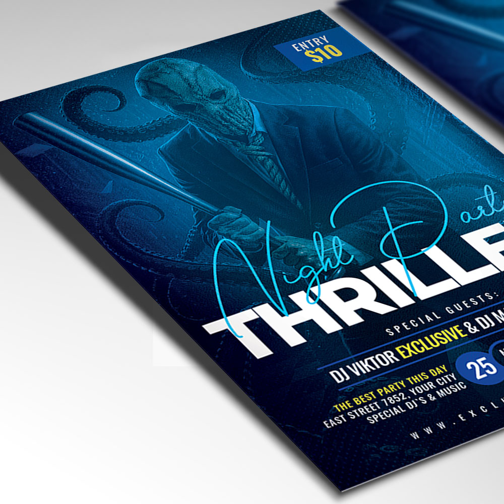 Thriller Party Flyer TemplateGet ready for a night of suspense and pure energy with our heart-pounding **Thriller Party Flyer Template**! This intense and captivating design is the perfect tool for promoting a mysterious club night, a Michael Jackson-themed dance event, a suspense-filled theme party, or any event where the atmosphere is charged with adrenaline and excitement. If you’re looking to create an irresistible invitation that screams “**are you ready for the thrill?**,” “**dance with danger**,” and “**a night you won’t survive (the dance floor)**,” this flyer template is engineered to draw a massive and enthusiastic crowd of party-goers and dance enthusiasts. Expect to see striking visuals, often incorporating energetic elements like dramatic silhouettes, intense lighting effects, dynamic poses (think classic dance moves!), and a bold, stylish typography that perfectly captures the raw, unsettling, and exhilarating spirit of a major **Thriller Party**. This template is all about setting a captivating, high-octane mood, making your “**Thriller Party**” the ultimate destination for an unforgettable experience in suspense and music. The **Thriller Party Flyer Template** offers a highly adaptable and professional layout, ensuring you can clearly communicate all the essential details of your event while perfectly maintaining its thrilling and inviting atmosphere. You can easily customize the text fields to include the specific date and time of your event, the electrifying venue location, any special entry requirements (e.g., ticket purchase details, dress code), and information about featured entertainment (e.g., a **DJ** spinning 80s hits, a **flash mob** performance), details on the **costume contest** (prizes and categories!), or enticing food and drink specials (e.g., “zombie punch,” “spooky cocktails”), all presented in a clear and appealing way. Add an enticing description of what attendees can expect, perhaps highlighting opportunities for a special **dance-off competition**, a themed photo booth, or simply mingling in a high-energy, suspenseful atmosphere. And of course, include clear contact information or prominent social media handles for further engagement and ticket sales. Many templates also provide exciting options to incorporate additional dynamic graphics like lightning effects, fog overlays, or bright neon accents, or to adjust the impactful color palette (often deep reds, sharp blacks, and vibrant whites) to perfectly match your brand’s aesthetic or the event’s specific theme. This lets you create a truly unique and memorable promotional piece that looks as chilling and exciting as your party feels. Engineered for maximum reach, the **Thriller Party Flyer Template** is designed to be both print-ready for stunning physical distribution and seamlessly optimized for digital sharing. This ensures your exciting invitation reaches a wide and enthusiastic audience. Create eye-catching physical flyers to distribute at clubs, dance studios, community centers, or through entertainment event groups. Effortlessly share the flyer digitally through various social media channels with engaging captions that highlight the night’s energetic vibe, email announcements that build anticipation, and online event listings that attract music lovers, dancers, and anyone looking for a thrilling night. This dual functionality helps to maximize visibility and create significant buzz around your Thriller Party. By utilizing this distinctive and attention-grabbing flyer template, you’re not just announcing a party; you’re creating an invitation that broadcasts pure, thrilling fun and promises an experience filled with great music, intense energy, and unforgettable memories, making your “**Thriller Party**” the ultimate destination for an epic gathering. Grab this template today and prepare to dance the night away! — Features of the Thriller Party Flyer Template